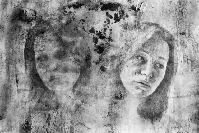 charcoal, transfer print, graphite, watercolor, charcoal powder